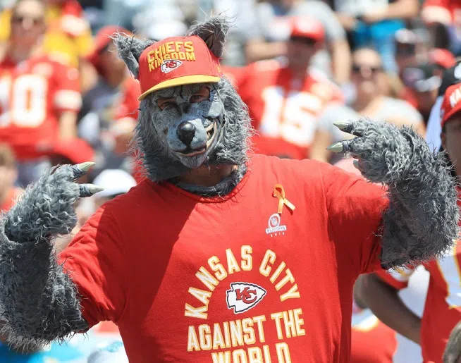 Xaviar Babudar loves the Chiefs so much, he attends game dressed in a furry wolf costume complete with wolf mask. Often wearing brightly colored team gear on top.