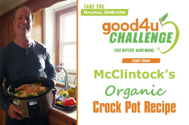 McClintock kitchen is doing the good4u challenge and trying out my own crock pot organic recipe: a whole chicken, with carrots, celery, green peppers, onions and potatoes. Salt, pepper paprika and coo...