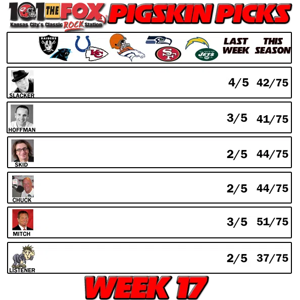 101 the Fox and Sprint present Pigskin Picks. Listen to the Slacker Morning Show, every Thursday morning at 6:50 to call in to pick the biggest games in the league and compare your picks to the 101 th...